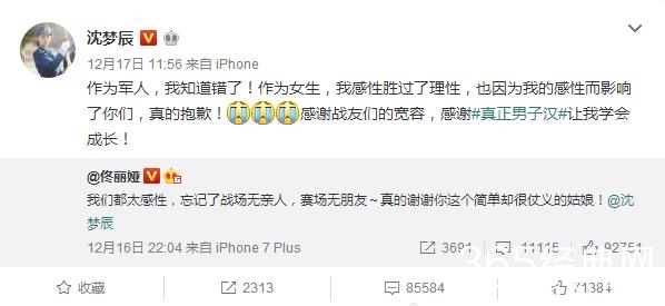 沈梦辰转发佟丽娅的微博道:作为军人,我知道错了!作为女生,我感性胜过了理性,也因为我的感性而影响了你们,真的抱歉!