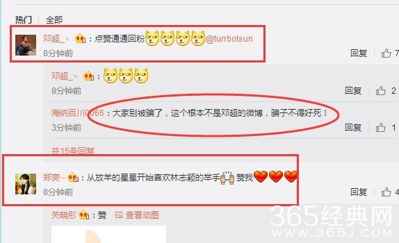 在林志颖的这条微博下,前两条被邓超和郑爽的评论占据了,邓超回复称点赞通通回粉,并艾特了娘娘,郑爽评论称从放羊的星星开始喜欢林志颖的举手。而这一切都没逃过眼见的网友,有网友评论称,大家别被骗了,这些根本不是明星本人的微博,而是来蹭粉的。看到这,那些上当的网友留言调侃称,知道真相后眼泪流下来了。