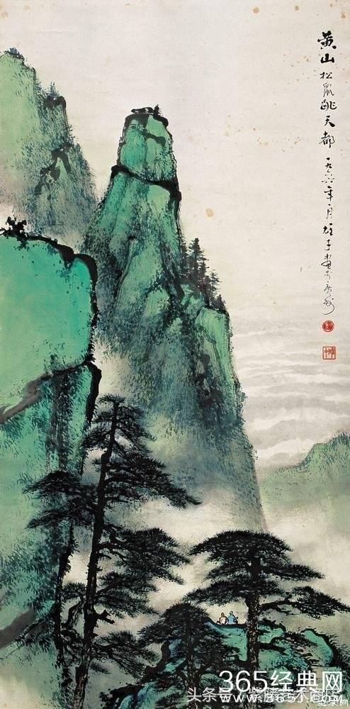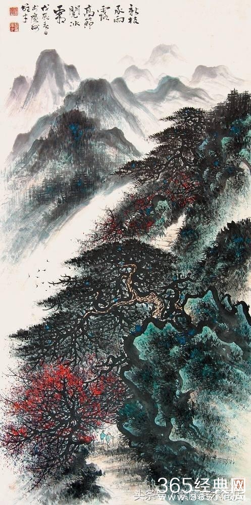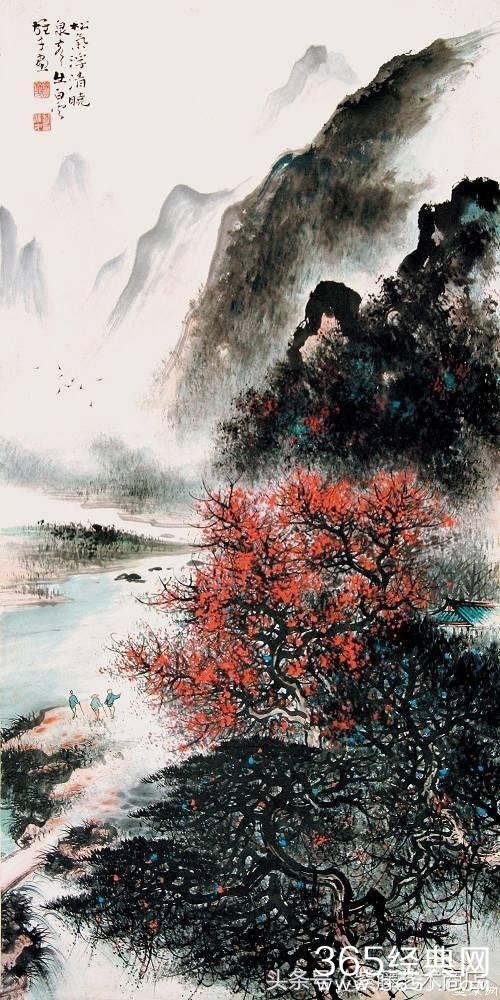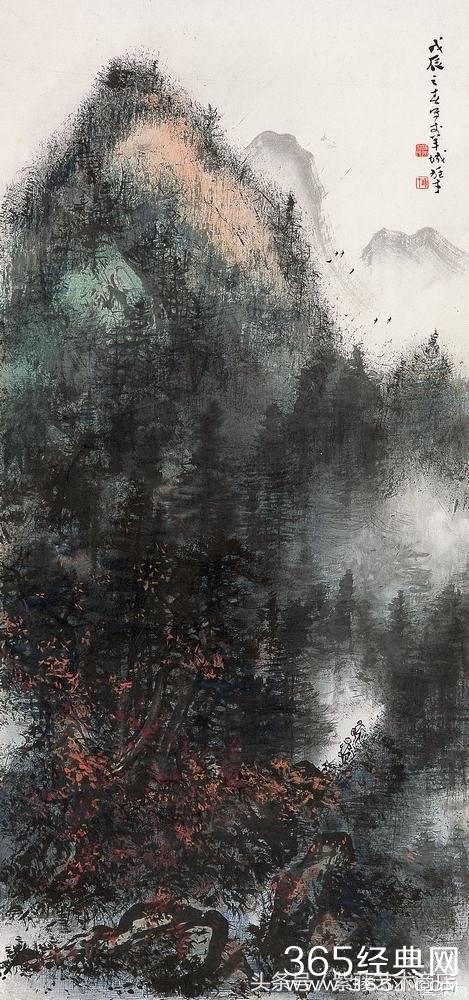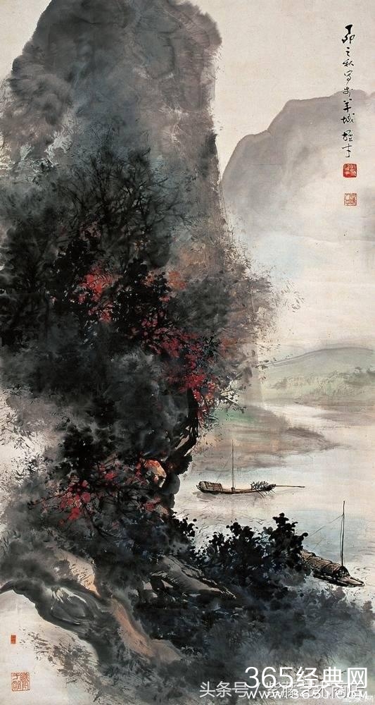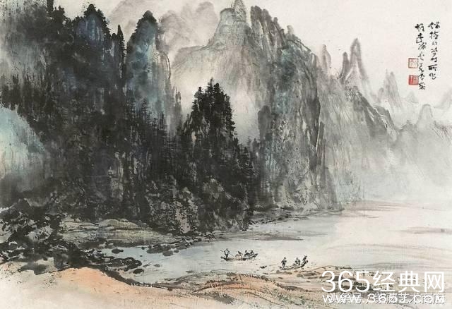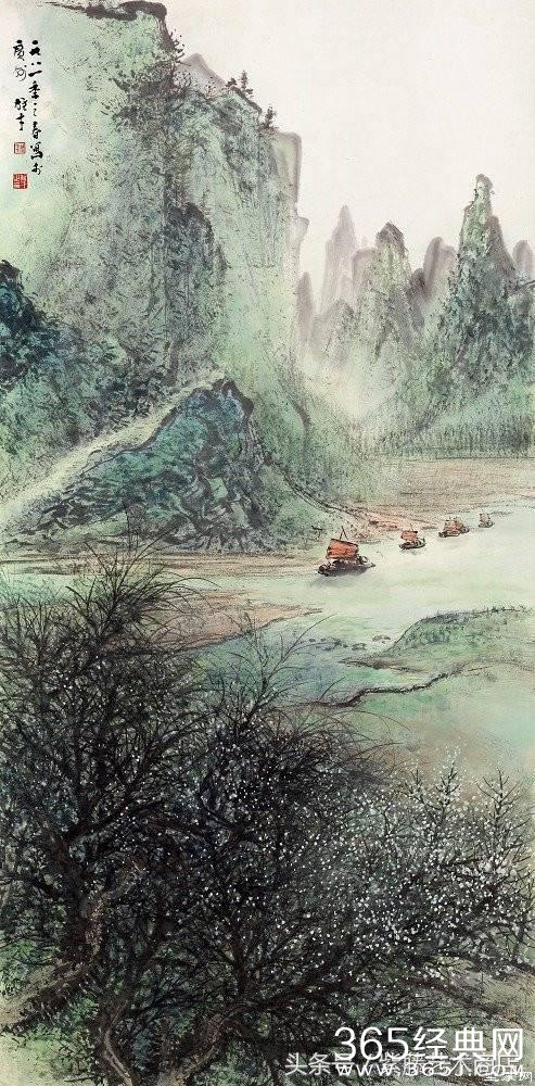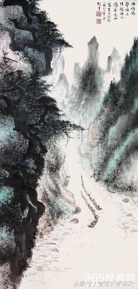 黎雄才晚年对“黎家山水”又有新的突破,他成功的揉合了厚得的青绿和粗笔深墨。《轻舟已过万重山》是他84岁时的作品。黎雄才主张作画时,“不管重彩还是淡彩,务须以墨为主”,在这幅作品中再次得到印证。他在墨稿的基础上,再敷上石青和石绿,颜色都是混合的,可以看出黎雄才已变化了对青绿的运用。他在描绘景色的同时,还表现出一种幽光,因而弥漫着氤氲的气象。黎雄才的努力,使山水画不再停留在表达社会背景的层面,而是在艺术上的推陈出新。