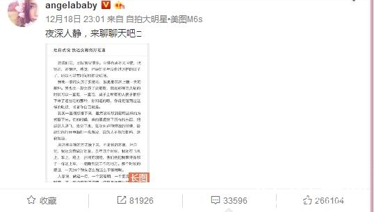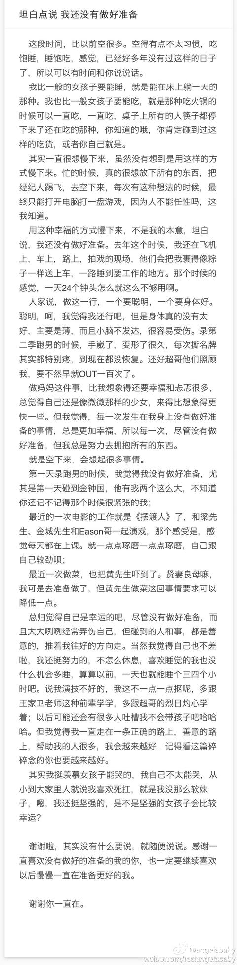 昨天晚上23点,杨颖在微博上发布长文:坦白点 我还没准备好。杨颖在长文中说到了自己的种种经历,在这几年里成长了很多,学会了很多。网友调侃:黄晓明都看哭了吧。