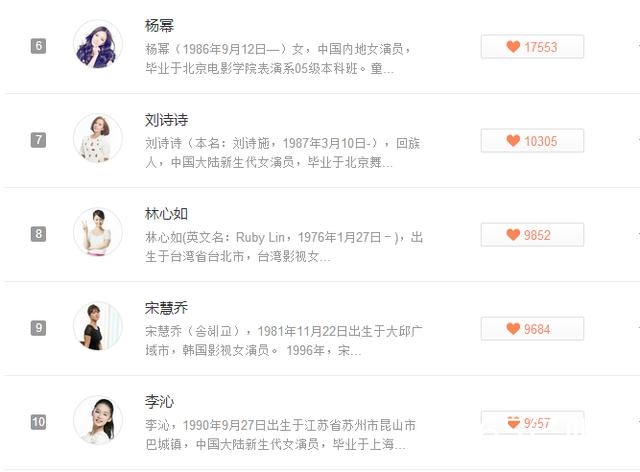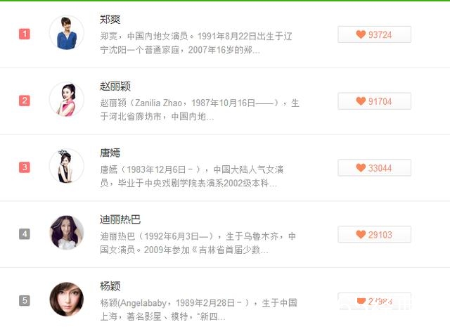 除此之外,“小骨”赵丽颖紧随其后,位居第二,和小爽一样,小骨也是好几个月都排在了小爽的后面,一直都是榜单第二,小粉加油投票啊!热恋的唐嫣第三、准妈妈Angelababy第五,具体榜单看下面↓↓↓