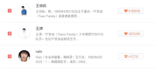 男歌手方面,小鲜肉王俊凯、王源暂居一、二名,Rain第三,鹿晗第四、易烊千玺第六,而TFboys组合暂居第九,也是厉害了,TFboys一个组合就能占据整个榜单前十的四个席位!