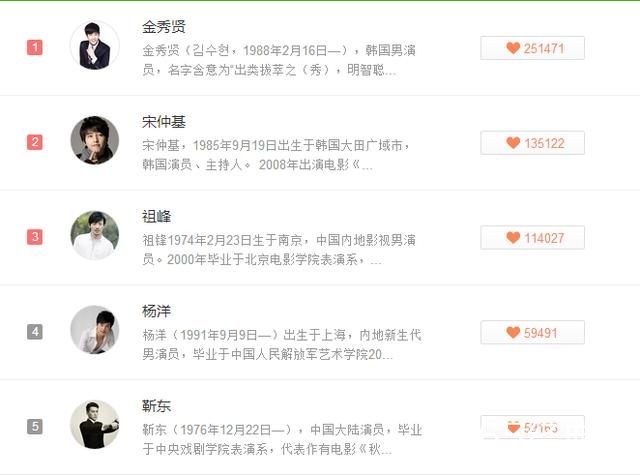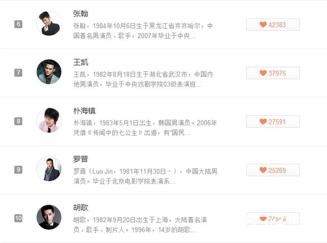 男演员方面,前三韩星占两席,金秀贤第一、宋仲基第二,国内小鲜肉杨洋第三,罗晋第九,而胡歌和霍建华“最佳cp”也是并驾齐驱,胡歌第十,霍建华无缘前十,暂居第十一。