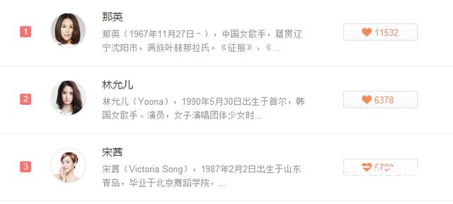 女歌手前三分别是那英、林允儿、宋茜,李宇春第四,邓紫棋第七,“四千年第一美女”鞠婧祎第十。