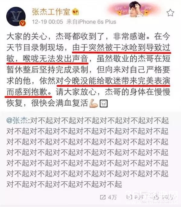 张杰工作室也在凌晨发出了微博,杰哥对没能给歌迷带来完美表演而感到抱歉。