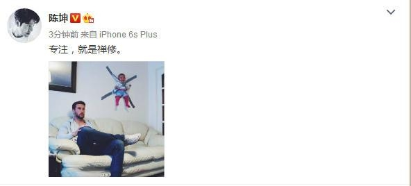 今天上午,陈坤微博晒出一张搞笑照片,“专注,就是禅修。”陈坤微博中写道。