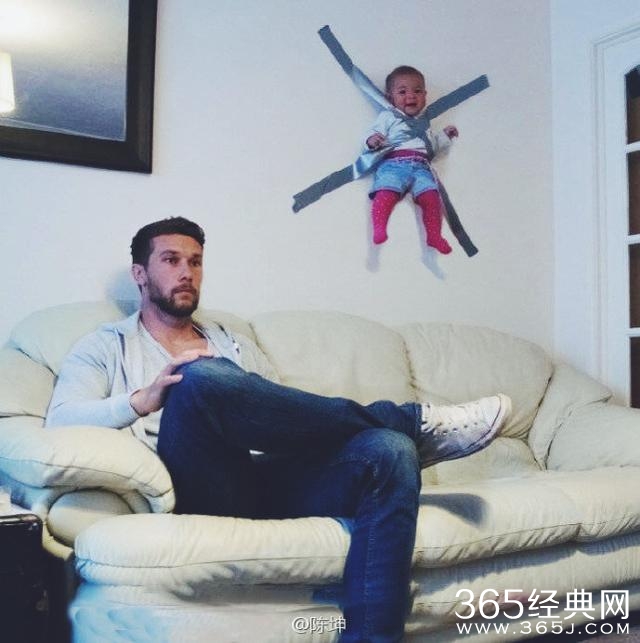 照片中的男士身穿休闲帽衫,牛仔裤,留着大胡子造型甚至还有几分贝克汉姆的样子,然而这不是重点。重点是墙上用胶带贴着那个娃娃。娃娃被胶带紧紧的贴在墙上,感觉真是有点瘆得慌。