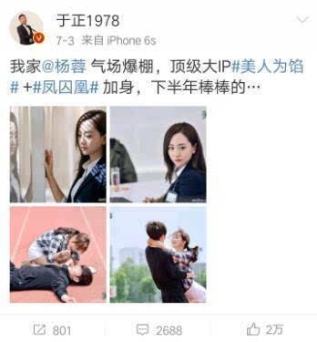2016年7月3日,于正更是表示下半年杨蓉顶级大IP加身,《美人为馅》+《凤囚凰》。