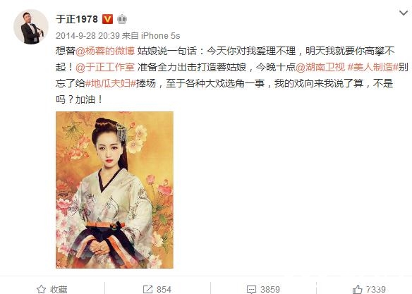 2014年9月28日,于正在微博上严肃表示,于正工作室准备全力出击打造杨蓉。