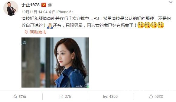 不仅如此,在今年10月,于正更是让网友推荐演技好颜值高并存的男明星,并且表示女的已经有杨蓉了!