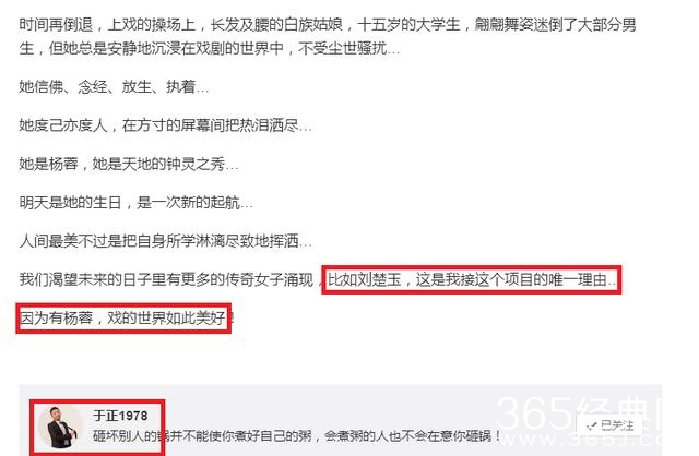 在这篇长微博的最后,于正更是表示杨蓉饰演刘楚玉是自己接下这个项目的唯一理由。