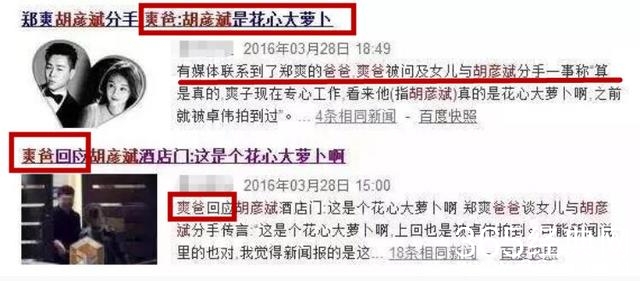 之前小爽和胡彦斌被爆酒店门,爽爸直言胡彦斌是花心大萝卜,这一评价被众多媒体争相报道,似乎对胡彦斌并不满意,也证实当时郑爽胡彦斌分手的事实。