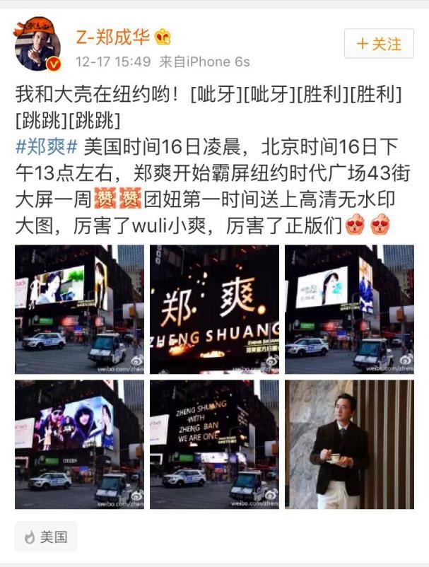 新剧杀青之后,郑爽已经一个多月没有出现在公众视线里,许多网友纷纷猜测爽妹子这次是不是又只要爱情不要工作了。不过今日郑爽爸爸的微博透露了女儿的行踪。郑爽的照片出现在纽约广场上,郑爽爸爸也开心的晒出了照片。郑爽爸爸发出微博不久,郑爽就上了热搜,真是自带热搜体质,在这里先恭喜爽妹子。