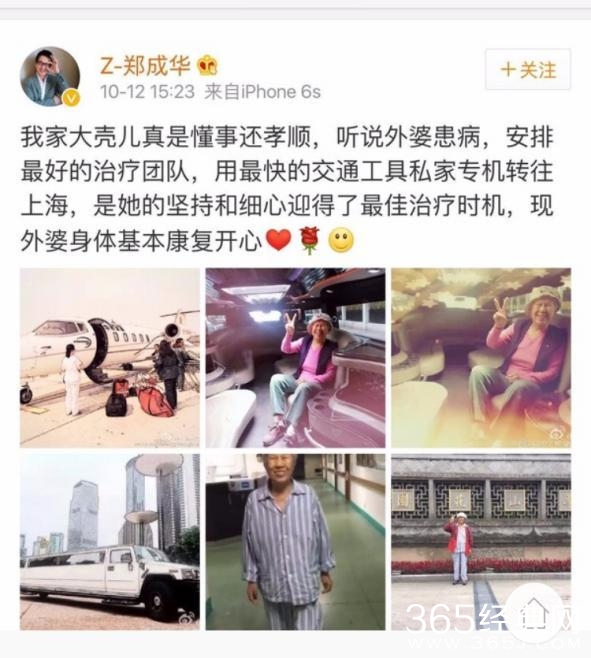 的确在照片中可以看到,专机内部装修十分豪华,和平常坐的飞机根本不是一个级别,下了飞机之后还有加长版的豪车等着生病的外婆,而外婆在飞机上照的照片里也是笑容满面。小爽为家人大方出手,爽爸心里也是很开心很欣慰,估计也没想到自己的这条微博会给小爽找来质疑吧。