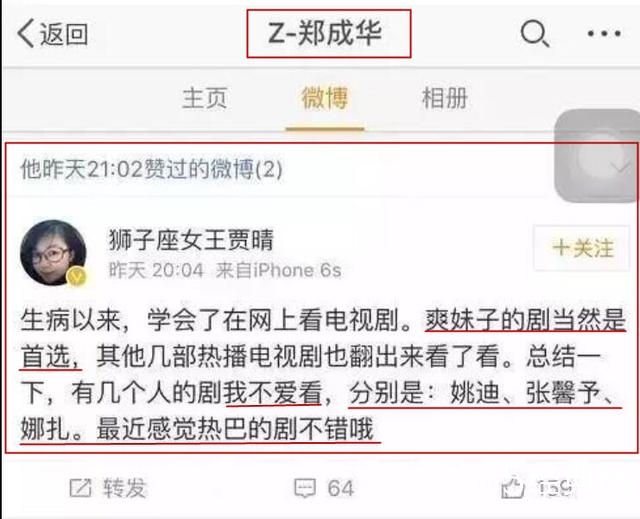 加上爽爸点赞过一条微博,这条微博的内容很明显在夸郑爽,贬低其他女演员。这一行为遭到其他女演员粉丝的不满。爽爸爸认为自己女儿优秀是应该的,但是也不能站在贬低别人的基础上夸赞自己的女儿啊。