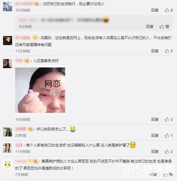 也有网友说:每个人都有自己的生活呀!也没碍着别人什么事,这人就是嫉妒罢了。羡慕嫉妒恨的人才这么黑豆豆,别的不说豆不炒作不整容。就过自己的生活,也是难得的了,黑豆豆也许是情敌派的水军吧!