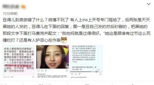 网友晒图说:豆得儿到底做错了什么?XX不玩了 有人上ins上开号专门骂她了,后两张是天天黑她的人发的,豆得儿在下面的回复,图一是豆自己发的然后秒删的,把黑她的那段文字下面打马赛克并配文:“我他吗就是过得很好。”她这是跟谁有过节这么死缠烂打?还是有人妒忌心在作祟。有网友回应说:说真的,这也就是在网上,现实生活有人当面这么骂不认识自己的人,不光会挨打还有可能是精神有问题