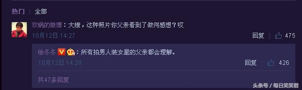 徐冬冬在拍男人装的时候,尺度还是有些大,于是又网友说:不知道你拍这种照片,你父亲看见会怎么想?徐冬冬:所有拍男人装的女星的父亲都会理解的。还转发并附言:不用想穿还是想脱,也不用理牌坊。因为自己走的路不需要像别人解释,如果想解释就证明你驾驭不了你想走的路,坦诚、微笑、面对最好的自己。