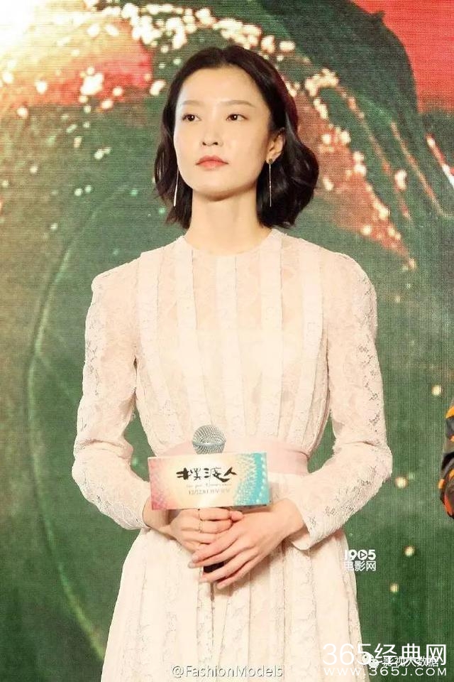 杜鹃身着Prada裸粉色蕾丝长裙出席电影《摆渡人》发布会。