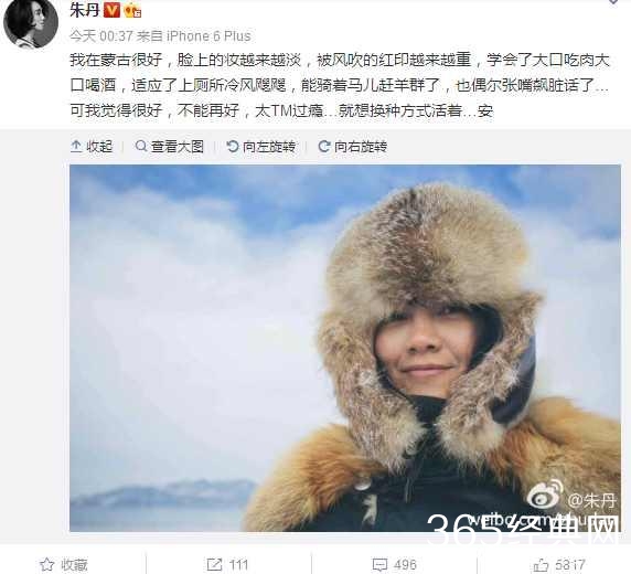 12月20日,朱丹在微博中晒出自己在蒙古的照片,称:“我在蒙古很好,脸上的妆越来越淡,被风吹的红印越来越重”。