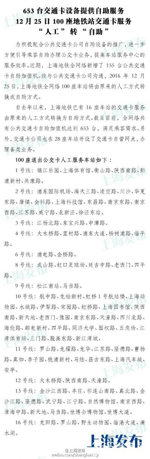 东方网12月20日消息:据上海发布消息,@上海地铁shmetro近期新增155台公共交通卡自助加值机,目前全网总数达653台。本周日(12月25日)起,上海地铁内100座车站的交通卡服务将由原来的人工办理转为自助。此外,乘客也可前往28座地铁站内的交通卡自营网点办理相关业务。
