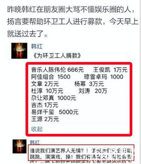 韩红气愤地狠狠地骂了一顿,宣布了大明星的捐款金额,有些人尴尬韩红不高兴回应这一事件,两人圈的朋友。但具体数额的脏话…连曝光星。为环卫工人捐款。