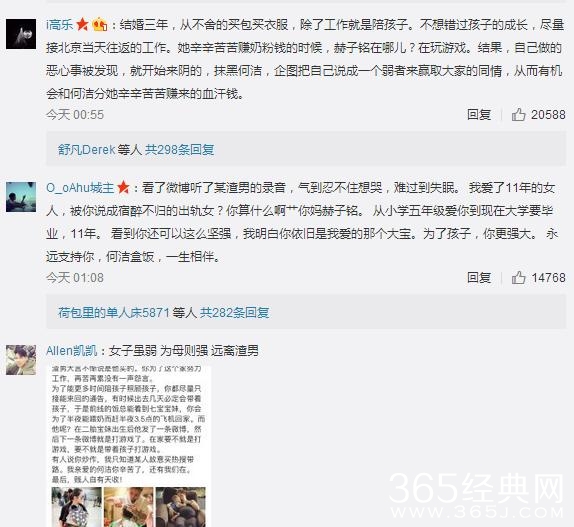网友评论:看了微博听了某渣男的录音,气到忍不住想哭,难过到失眠。 我爱了11年的女人,被你说成宿醉不归的出轨女?你算什么啊艹你妈赫子铭。 从小学五年级爱你到现在大学要毕业,11年。 看到你还可以这么坚强,我明白你依旧是我爱的那个大宝。为了孩子,你更强大。 永远支持你,何洁盒饭,一生相伴。