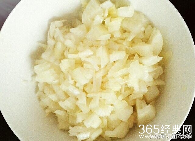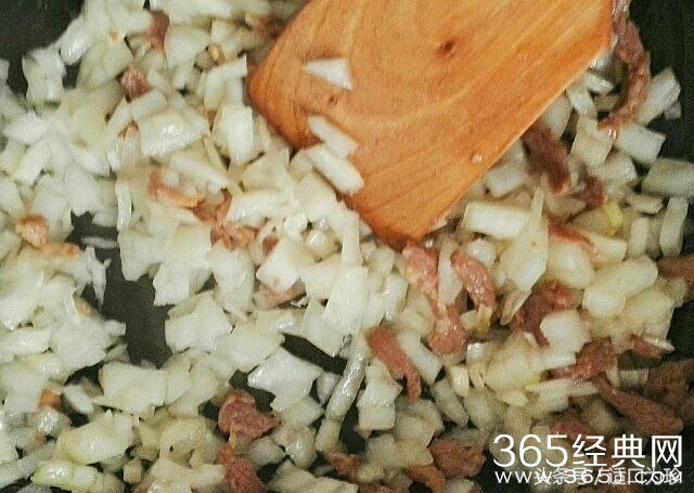 倒入洋葱粒,大火快炒,炒出香味,炒到洋葱开始变软时