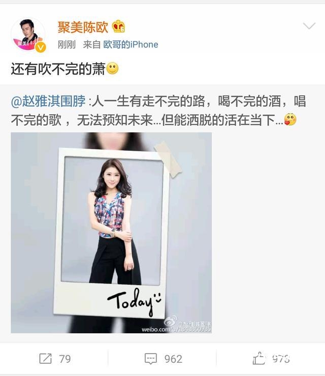 11月17日,网曝林丹在妻子谢杏芳孕期出轨。当天,林丹被拍到牵手长腿嫩妹,而出轨对象是赵雅淇,赵雅淇曾在微博发文:人一生有走不完的路,喝不完的酒,唱不完的歌 ,无法预知未来…但能洒脱的活在当下…11月17下午,陈欧却转发了赵雅淇的这条微博,并调侃的配文:还有吹不完的萧。