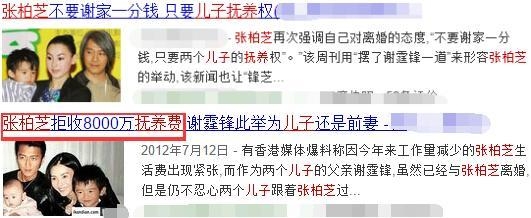 张柏芝在离婚之际,为了要两个儿子的抚养权,拒绝接受谢霆锋给的抚养费,所以两人离婚时才没有撕逼,和平分手。