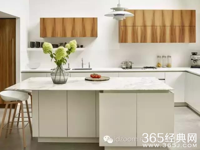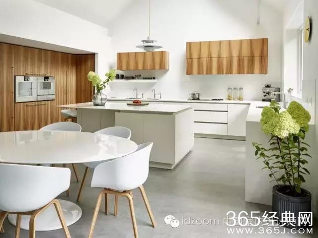 ▲白色的开放式厨房简约感十足,餐桌、厨柜、吊灯等设备以北欧风格为主,线条柔美,用植物点缀空间,更添鲜活力。