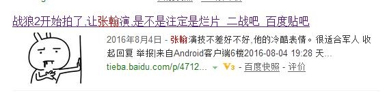 甚至还有网友专门开个贴来吐槽张翰参演《战狼2》这事呢。