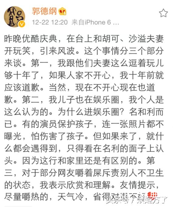而对于老郭与沙溢夫妻之事要说严重其实鸡毛蒜皮的事,本身没什么,被网友这么一传就复杂了,再加上郭德纲的冷言嘲讽更热闹了。老郭的为人我们也可以猜测的七七八八,人家就那样的性格;而网友们确实存在一些心机不纯的人,没必要非要揪着不放。