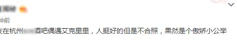 网友说:在杭州某酒吧偶遇艾克里里,人挺好的但是不合照,果然是个傲娇小公举 。