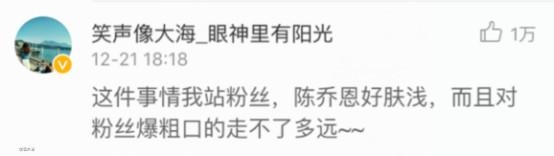 明明是担心偶像以后的发展,却被误认为了黑子一顿狂喷。就算是路人也替那位粉丝感到寒心。难道粉丝连表达自己不同意见的权利也没有了吗?还是说陈乔恩只想听那些“我爱你”的甜言蜜语。可是抱歉,普天之下能让所有人夸赞的只有钱!