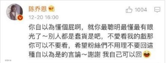 客观来讲,其实这位粉丝说的话并非全无道理,陈乔恩面对的只是“失望”和“质疑”,作为明星,作为演员,当你的作品不够硬气,有人批评是很正常的事情。既然是公众人物,吃瓜群众就有对你演技和作品质疑的言论自由。周迅从大荧幕回归小荧幕演《如懿传》不也一样有很多人批评她“倒退”吗?
