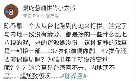 简单描述一下事件吧,22号晚上有一个喜欢陈乔恩多年的资深粉丝表示对陈乔恩很失望,因为“37岁还在演偶像剧,11年来没有任何改变”。