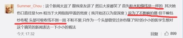 是怎么回事呢?官方说辞是这样的:据说黄灿灿头部伤口直径约一厘米,为了不影响拍戏,黄灿灿没有直接缝针,而是选择保守治疗,暂时用医用胶处理伤口,很是敬业。瞧这照片,感觉好像伤得不轻,心疼妹子一分钟~