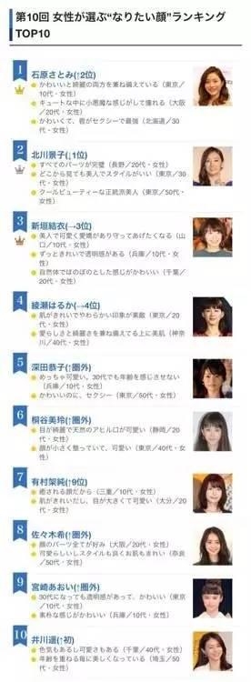 日本公信榜每年的惯例调查,由女性投票选出的“最想变成的脸”女星TOP10,近日发表了今年第十届的入选名单。