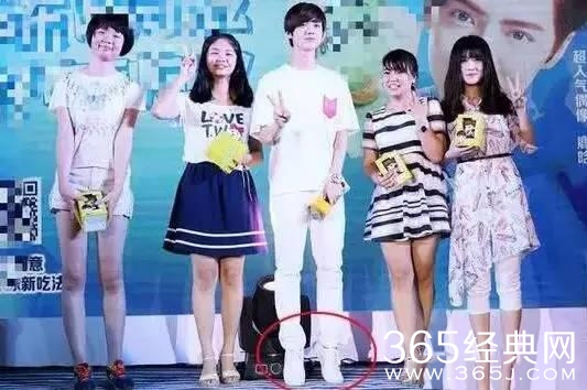 就算是和粉丝的合影也不忘了自己高大的形象。身高不够垫脚来凑