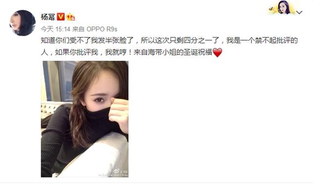要不要这么耿直啊,这是自黑成瘾了吗?不过对于杨幂露脸四分之一的自黑,个人觉得萌的不行,恩,就是萌的不行。虽然杨幂为人母,但是“萌”这个词仍旧适合她。