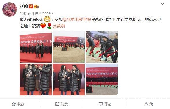 赵薇爆照说:做为资深校友,参加@北京电影学院 新校区落地怀柔的奠基仪式。地杰人灵之地!祝福黄渤。网友看照说:优秀的校友,好美呀!