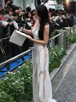出现在日本街头的张馨予正在耐心的为粉丝签名,只是她穿的这身礼服实在是十分吸睛。如果你并没有看出这身礼服有什么异样?那么看张正面图。