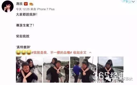 她在微博上刷了一组照片,说:“大家都说我胖!导演生气了!背起我说,真特么胖。”