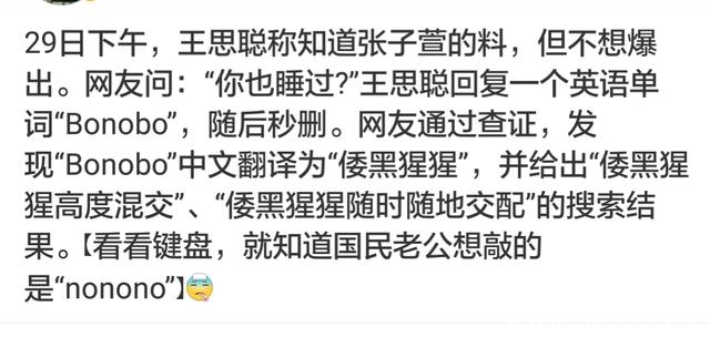 思聪发微博称知道张子萱的料,虽然没有正面回答这个问题,但是回了一个单词:bonobo.随后秒删。这个单词是意思是倭黑猩猩,据说是一种高度混交的动物,热衷于交配。