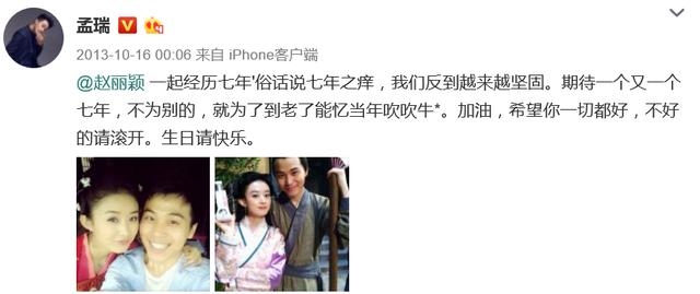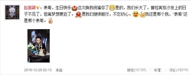 而赵丽颖呢!在凌晨也发了一条生日祝福的微博,但是却不是给尊上霍建华的而是一个叫做孟瑞的男星,直言:表哥,生日快乐。这次换我祝福你了,是的,我们长大了,曾经窝在沙发上的日子不见了,但离梦想更近了。愿我们继续前行,不忘初心。我还是那个我,“表哥”还是那个表哥。