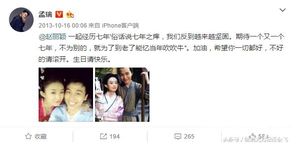 随后赵小刀也发了微博祝福表哥,不过这回的祝福却不是给我了表哥霍建华,而是给了他!