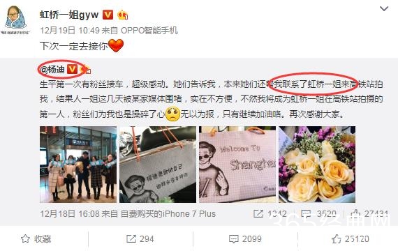 先跟着小佳来看下某些明星的做法。最近上了几次《快乐大本营》的杨迪,这次就在微博里写到:“本来她们还帮我联系了虹桥一姐来高铁站拍我,结果人一姐这几天被某家媒体围堵,实在不方便,不然我将成为虹桥一姐在高铁站拍摄的第一人。”