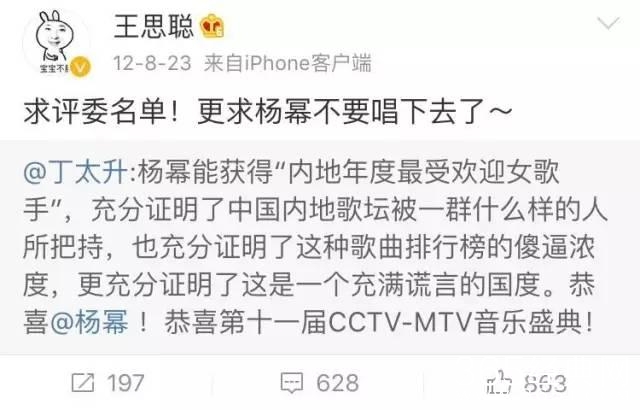 思聪说:就是因趣斯汀啊。我和杨幂不认识,没吃过饭没怎么样,算是网友。最近的距离就是同场,没近距离交流。