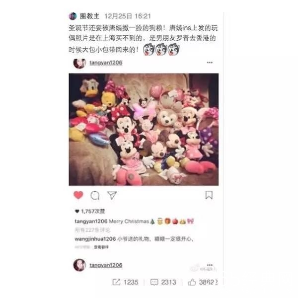 同样撒狗粮撒得不亦乐乎的还有刚刚公布恋情的甜蜜小情侣唐嫣罗晋!圣诞节当天,有博主晒出唐嫣在INS上发的玩偶,表示:“圣诞节还要被唐嫣撒一脸的狗粮!”